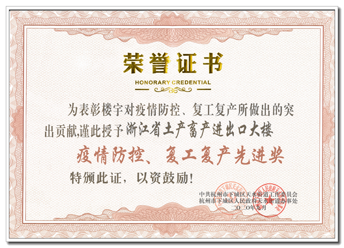 近日,省土畜因疫情防控和復工復產表現突出、對地方財政貢獻成績顯著、促進天水地區樓宇經濟社會發展成效明顯,被天水街道授予“2019年度天水地區樓宇經濟優勝單位二等獎”、“疫情防控、復工復產先進獎”兩項榮譽稱號。