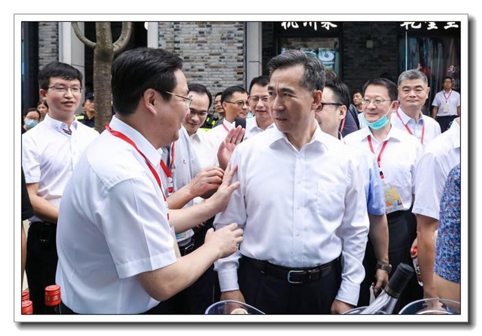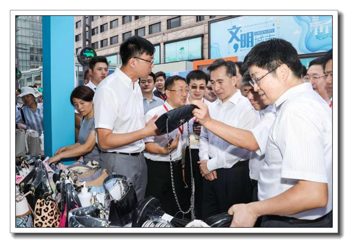7 月 25 日,商務部、浙江省人民政府共同主辦的 “外貿優品匯,扮靚步行街”出口產品轉內銷(杭州站)活動周在杭州湖濱步行街啟動。作為省國貿集團下屬商貿旗艦企業,浙江土畜集團堅決貫徹國家構建國內國際雙循環的決策部署,加快開拓出口轉內貿渠道,積極組織 5 個出口業務部,設立 8 個展位銷售箱包、服裝、遮陽傘、口罩、保溫杯、香薰等優質出口產品。商務部部長助理任鴻斌、浙江省人民政府副省長朱從玖親自蒞臨活動現場指導工作。